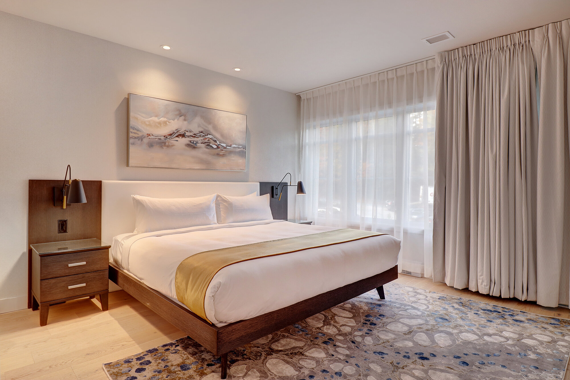 The Lake View Penthouse features two balconies overlooking the lake, a private terrace, a fully equipped kitchen, two bedrooms with King beds, and a fireplace.