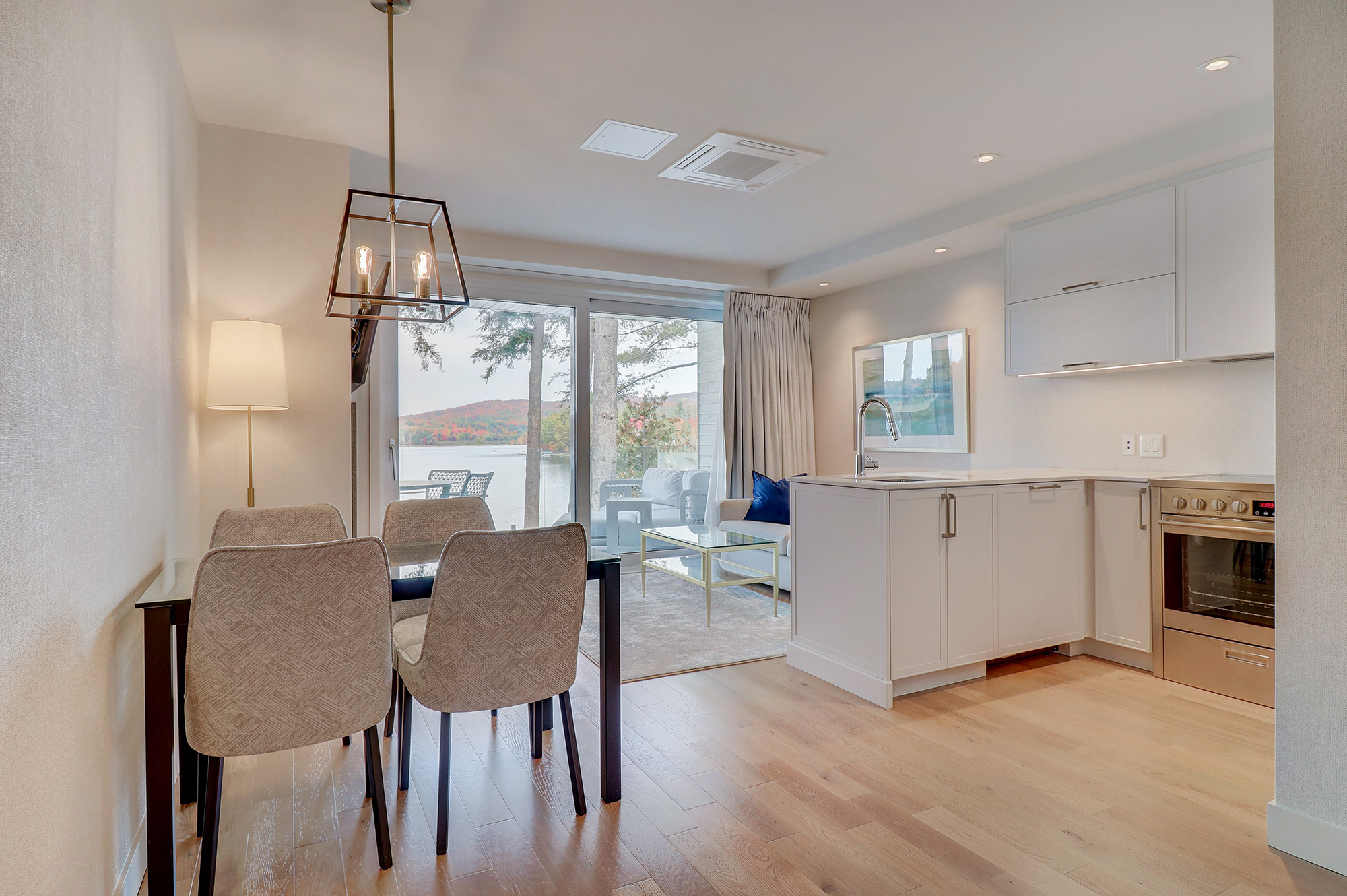 The Superior suite includes a semi-closed bedroom with a king bed, a balcony with a view of the lake, a full kitchen, and a fireplace.